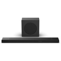 La barre de son Hisense HS2100 délivre une puissance totale maximale de 240W. Elle dispose d'un port HDMI ARC, d'une entrée optique et est compatible Bluetooth 5.0.